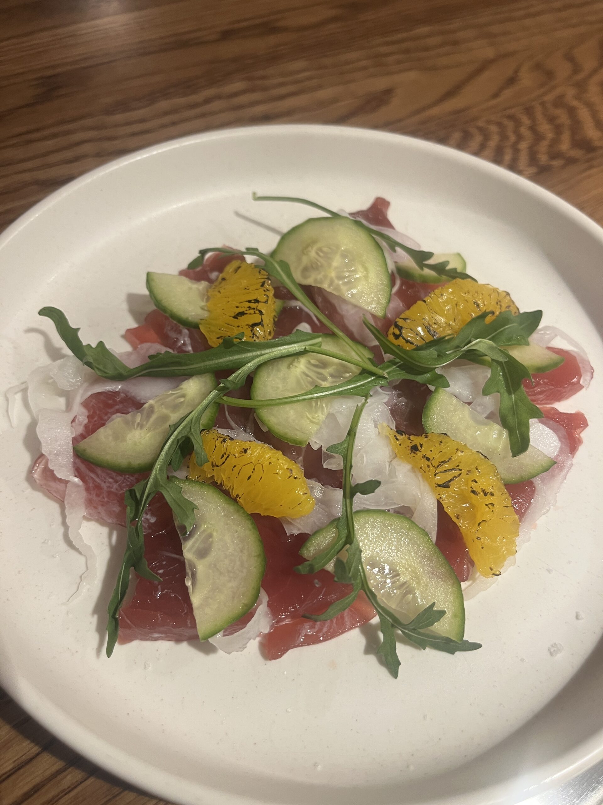 先日訪れたレストランで、忘れられない一皿に出会いました。ツナのクルード、ウイキョウのピクルス、キューリ、焦がしグレープフルーツという、見た目にも美しい前菜です。