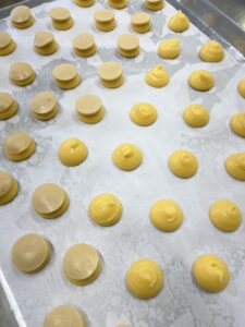 6. 絞る 天板にオーブンシートを敷き、生地を丸く絞ります(直径4-5cm程度)。