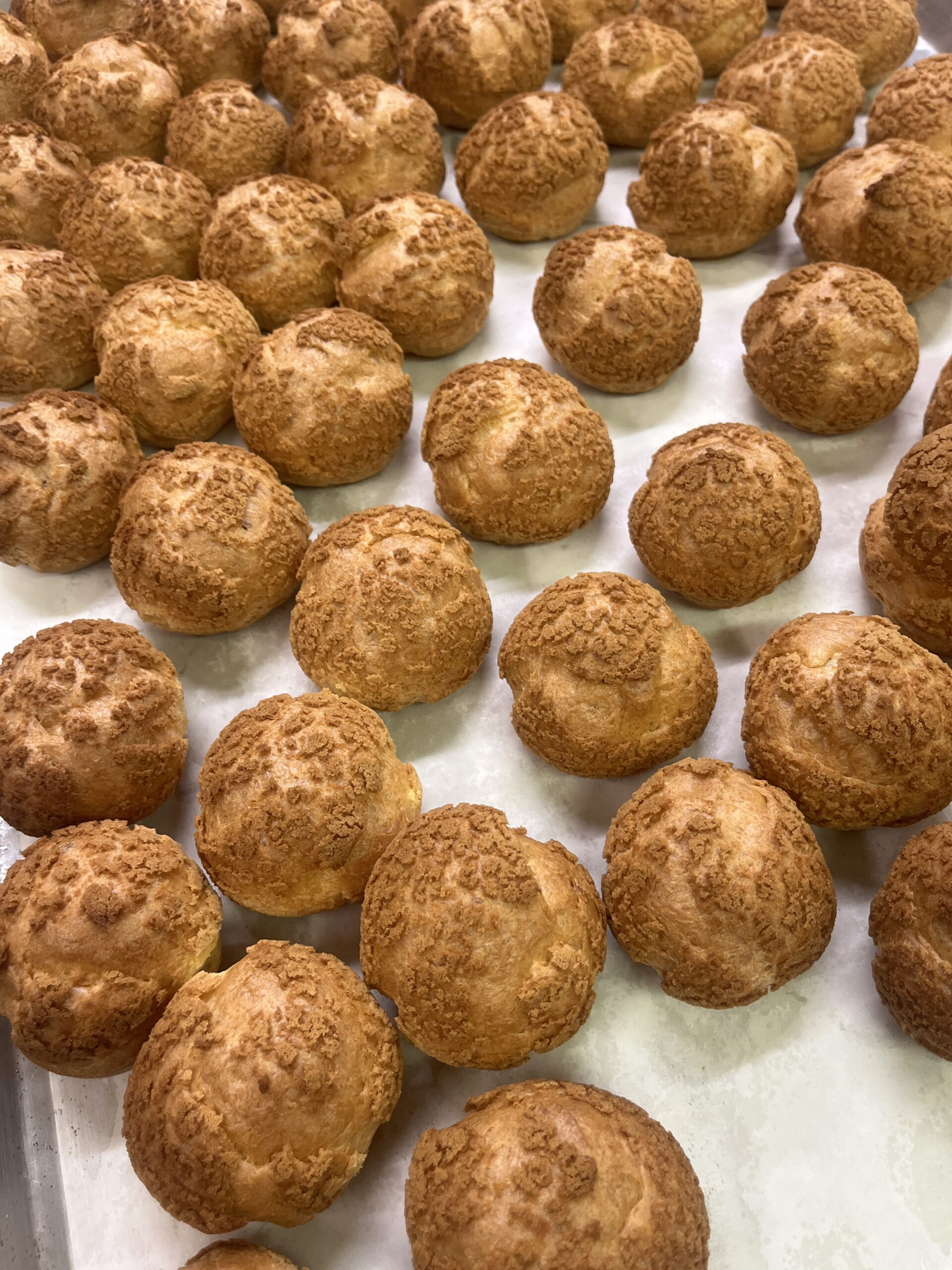 焼き上がりの黄金色に輝くシュークリームは、まさに絶品。外はサクッと、中はふんわり空洞ができた理想的な仕上がりです。