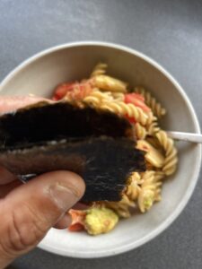 今回は、昨日茹でた余りパスタ、アボカド半分、キムチ、ゆで卵1個、そして海苔だけで作れる5分パスタサラダをAIの助けを借りてご紹介。