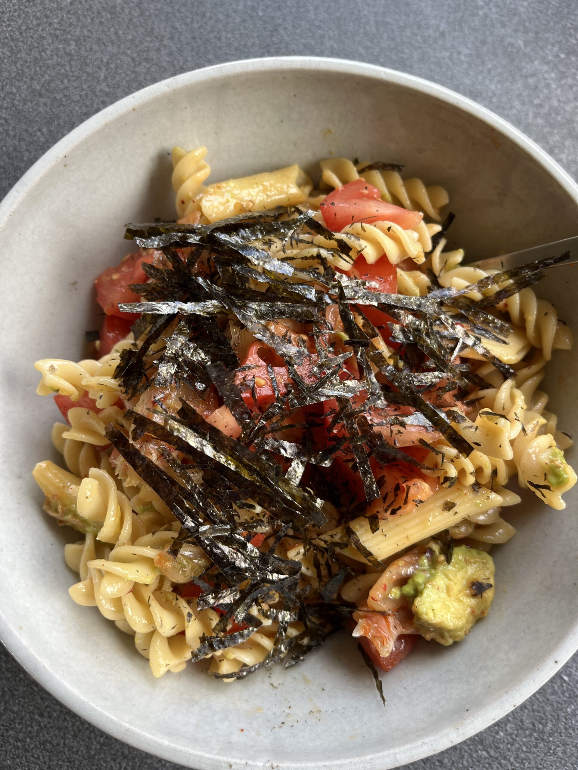 今回は、昨日茹でた余りパスタ、アボカド半分、キムチ、ゆで卵1個、そして海苔だけで作れる5分パスタサラダをAIの助けを借りてご紹介。